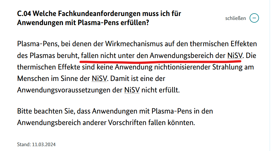 📌 Согласно официальным разъяснениям Федерального министерства окружающей среды Германии (BMUV), плазменные ручки (Plasma Pen), работающие за счёт теплового плазменного воздействия, не подпадают под действие постановления NiSV.